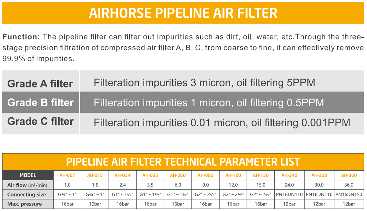 • Through the three-stage precision filtration of compressed air filter A, B, C, from coarse to fine, it can effectively remove 99.9% of impurities.